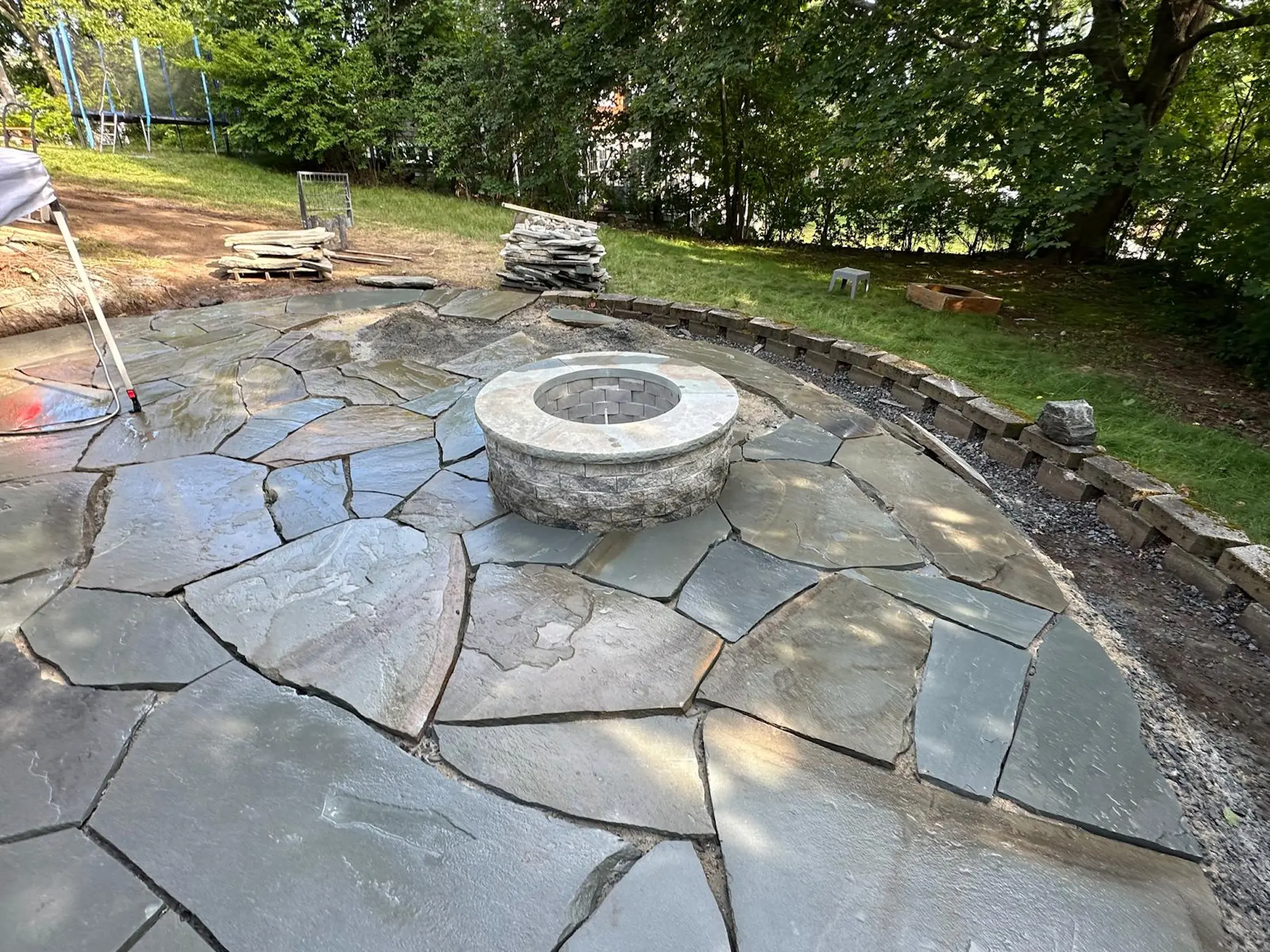 Projects include patios, walkways, stone steps, retaining walls, and outdoor living features designed for long-term use.